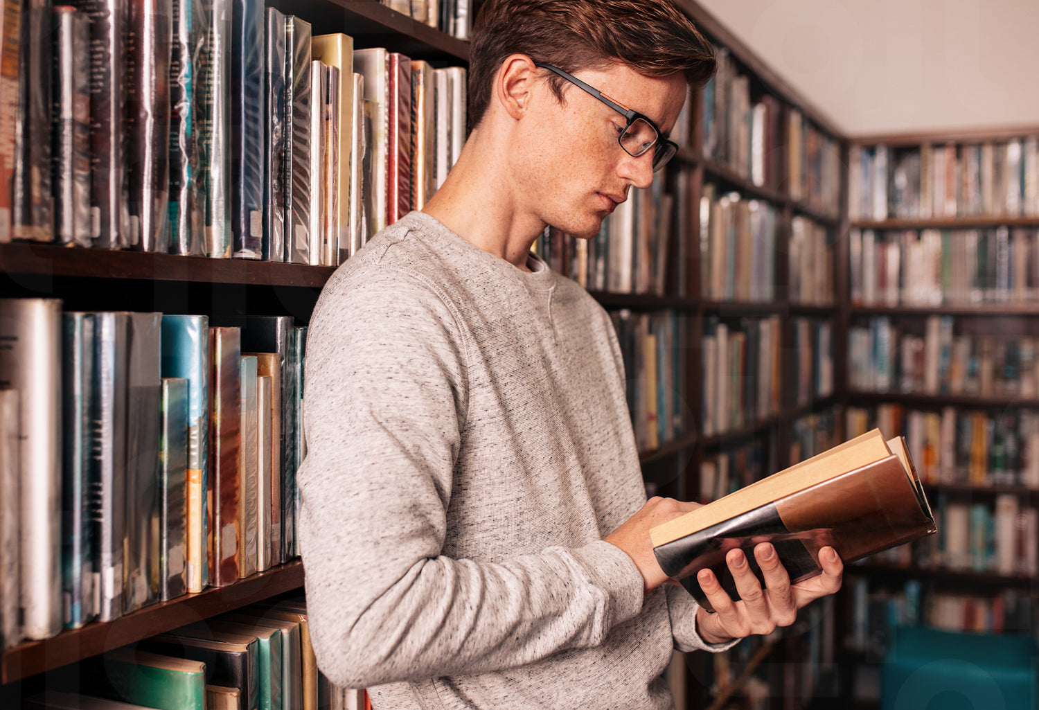 Young university student reading a book in library. College student standing by bookshelf in library with a book.