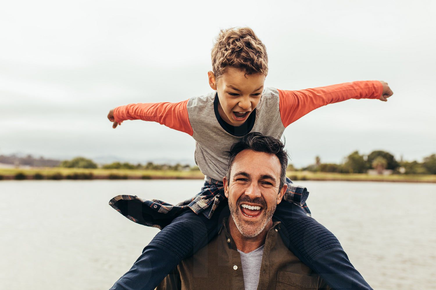 Boy sitting on the shoulders of his father and playing. Father and son having fun spending time together near a lake.
