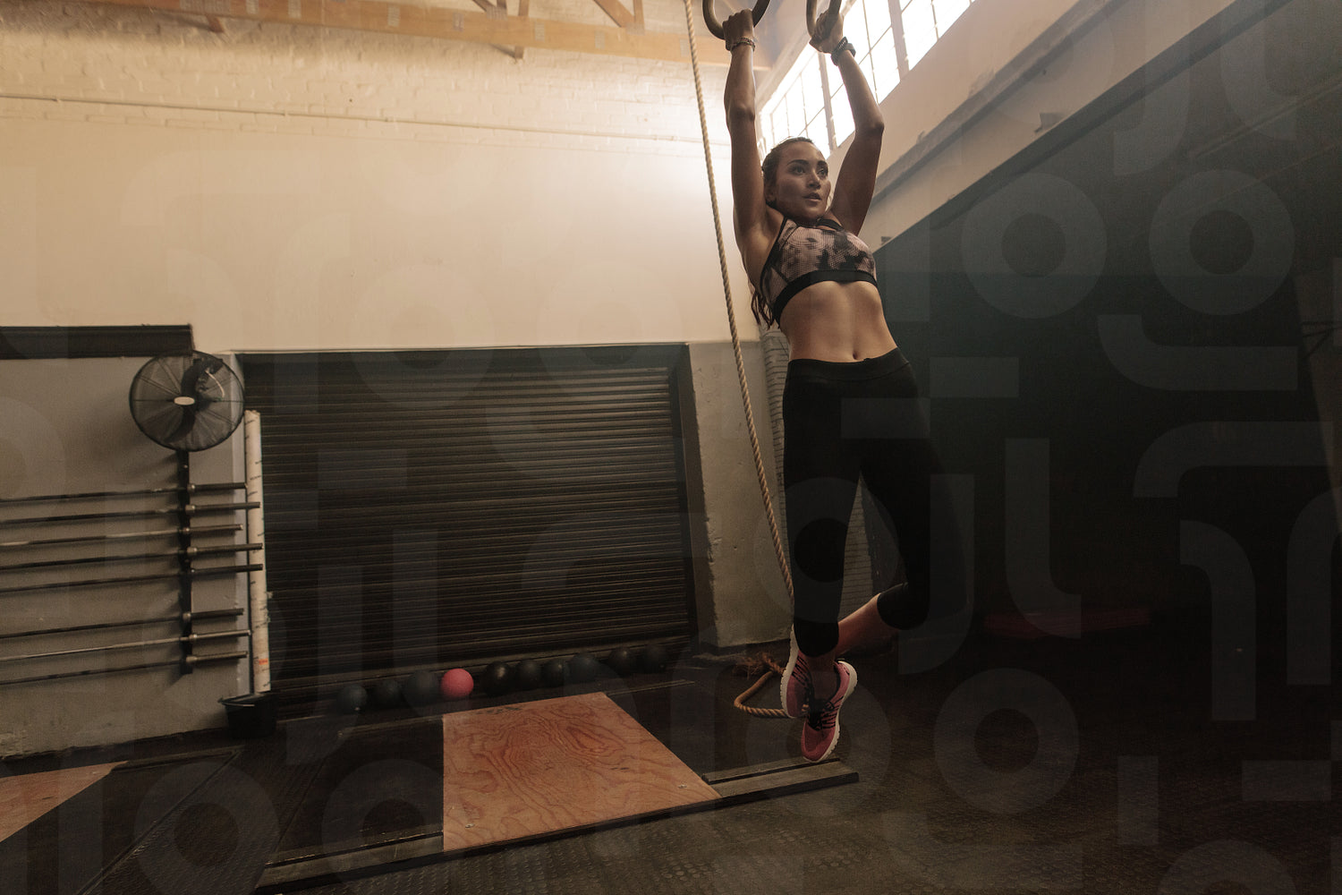 Fitness female hanging on gymnastic rings. Young woman exercising with dip rings at gym.