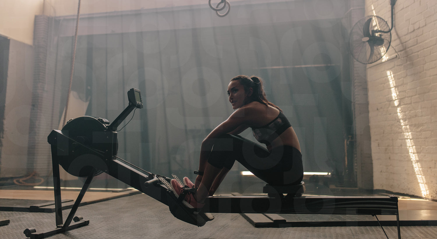 Young woman sitting rowing machine at the gym. Female doing cardio exercise in fitness club.