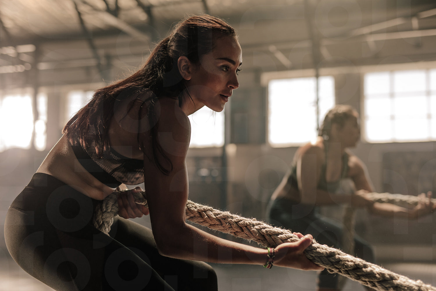Young women exercising with rope at a gym. Fitness female pulling rope at gym.
