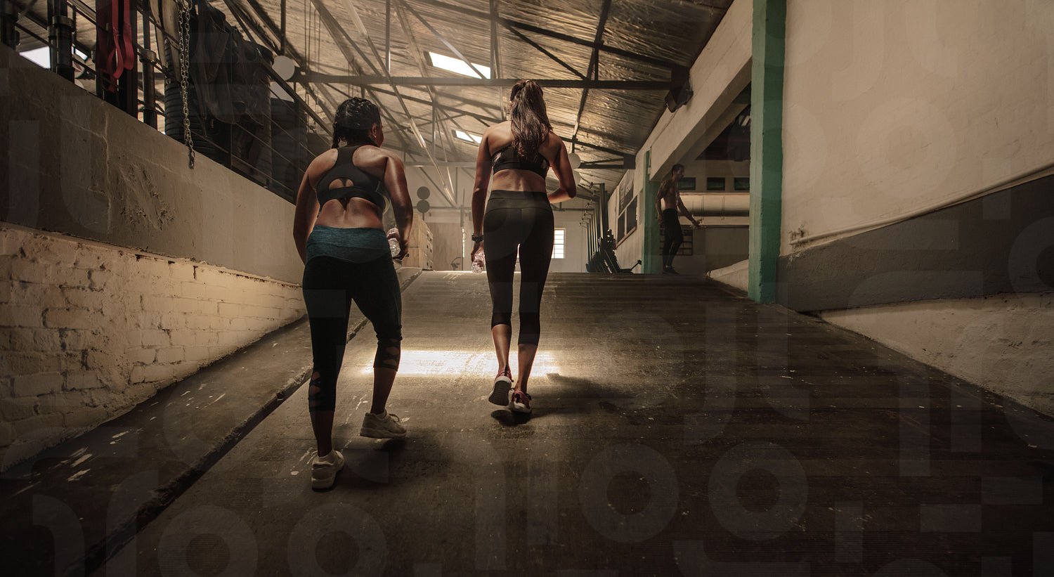 Two women walking in the cross training gym. Shot from behind of fitness females going in the health club.