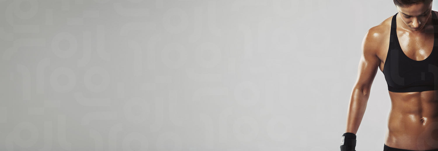 Fit woman with sixpack abs isolated on grey background. Workout and fitness concept of healthy woman.