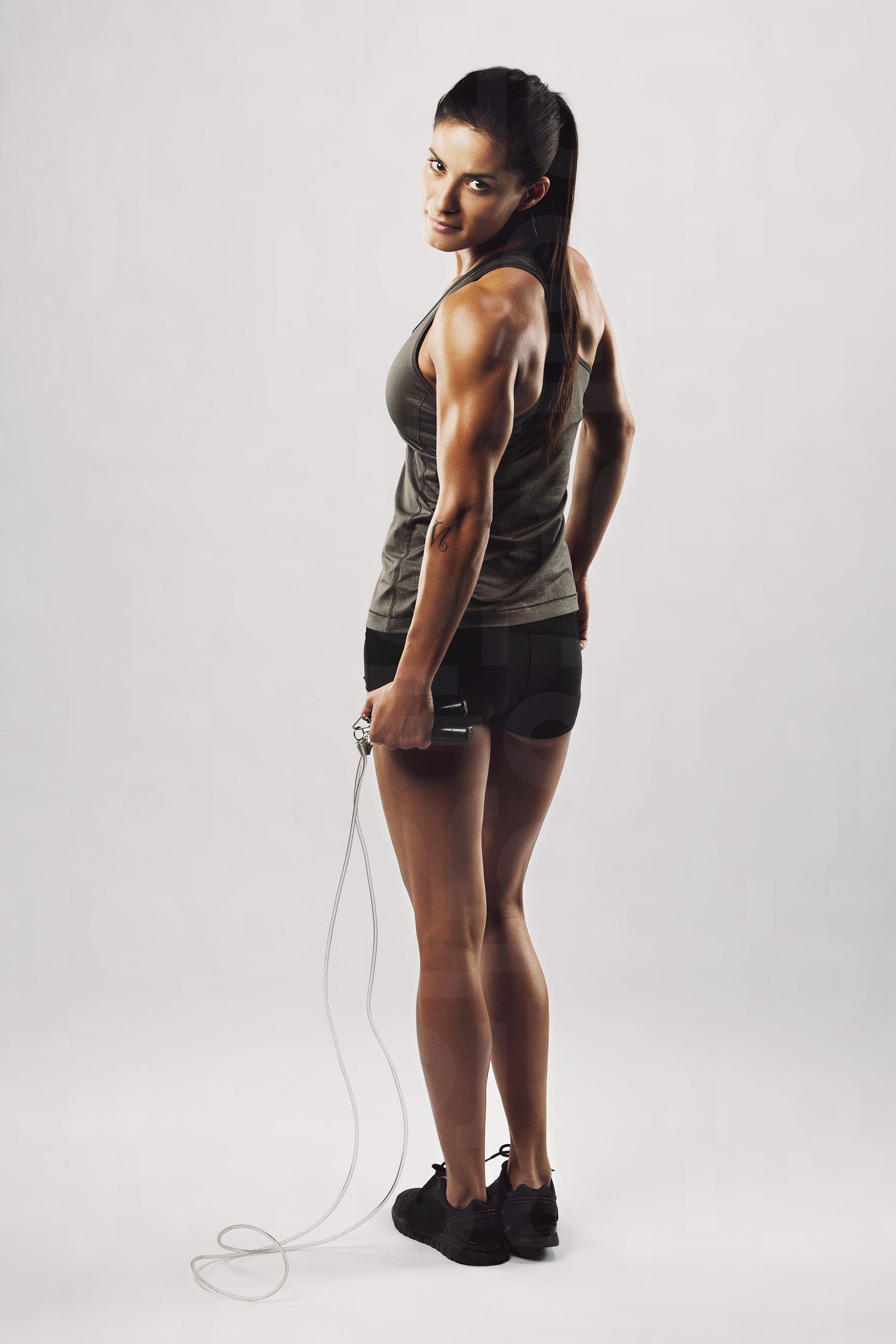 Vertical shot of young female exercises with a jump rope looking over shoulder at camera. Muscular woman exercising on grey background. Full body shot.