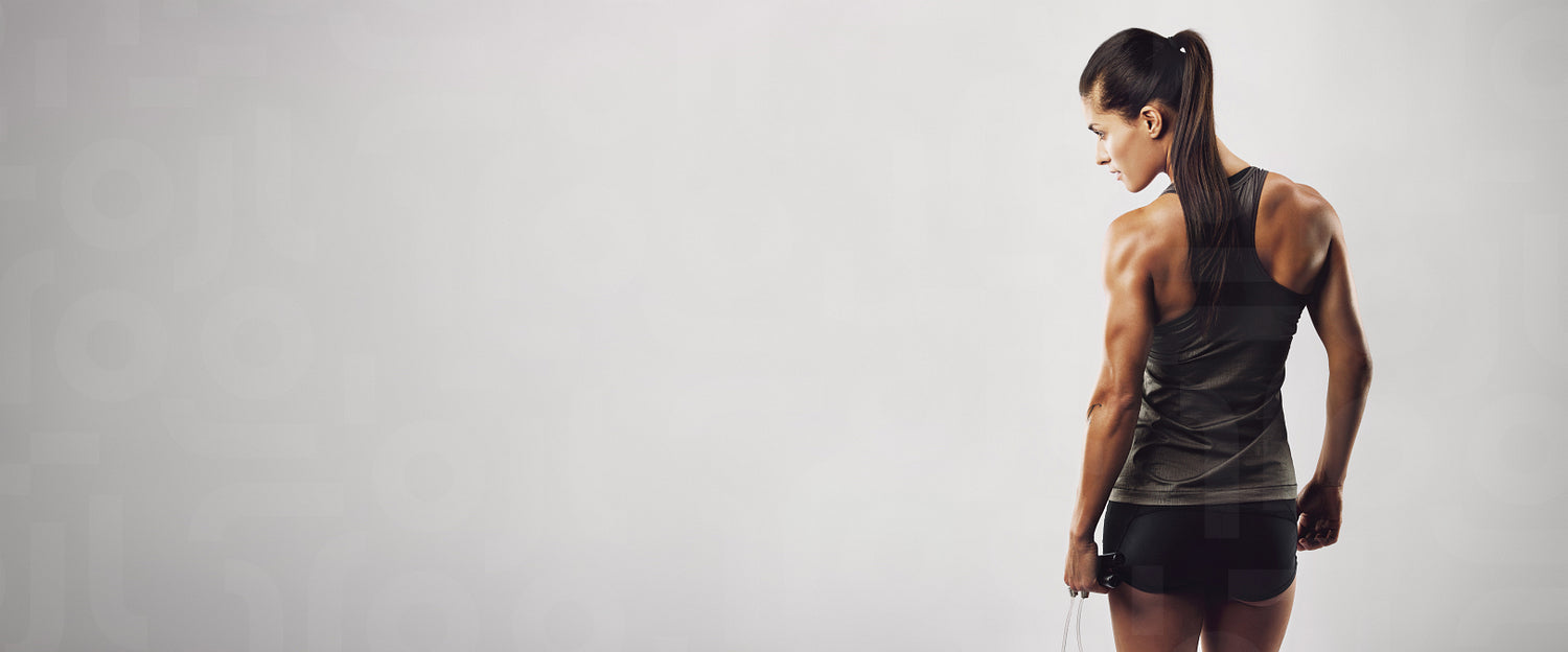 Rear view of fit woman standing with a skipping rope. Concept of healthy lifestyle with fitness.