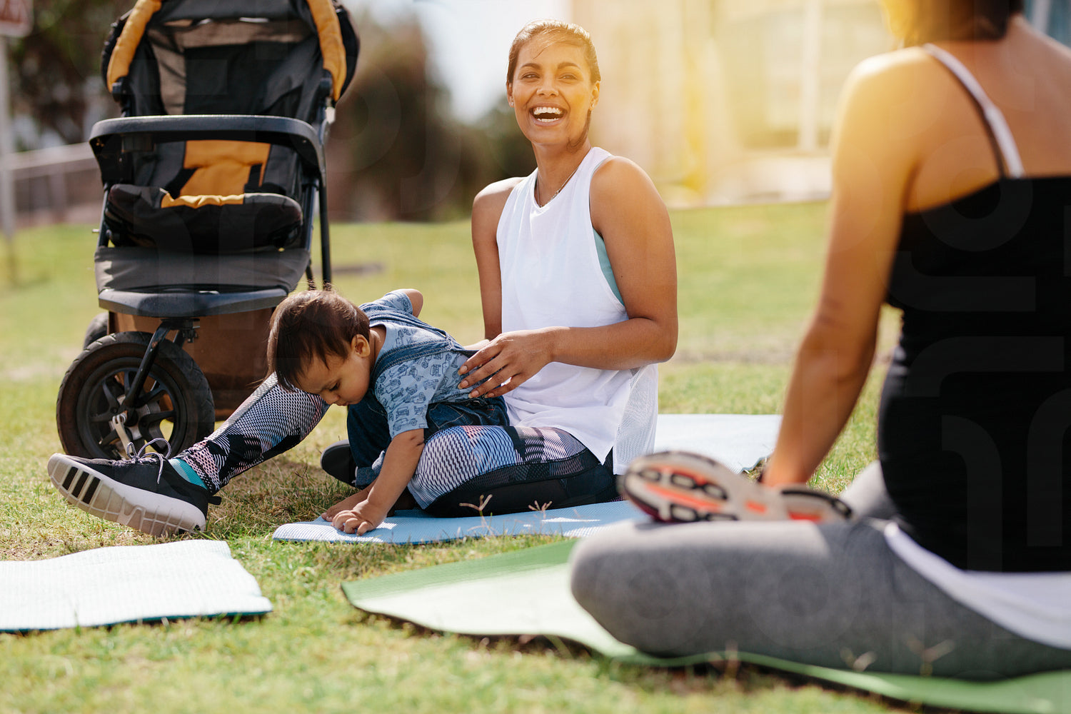 Smiling mother with her kid sitting in park on a yoga mat with a baby stroller beside her. Women in park with kid doing yoga early in the morning.
