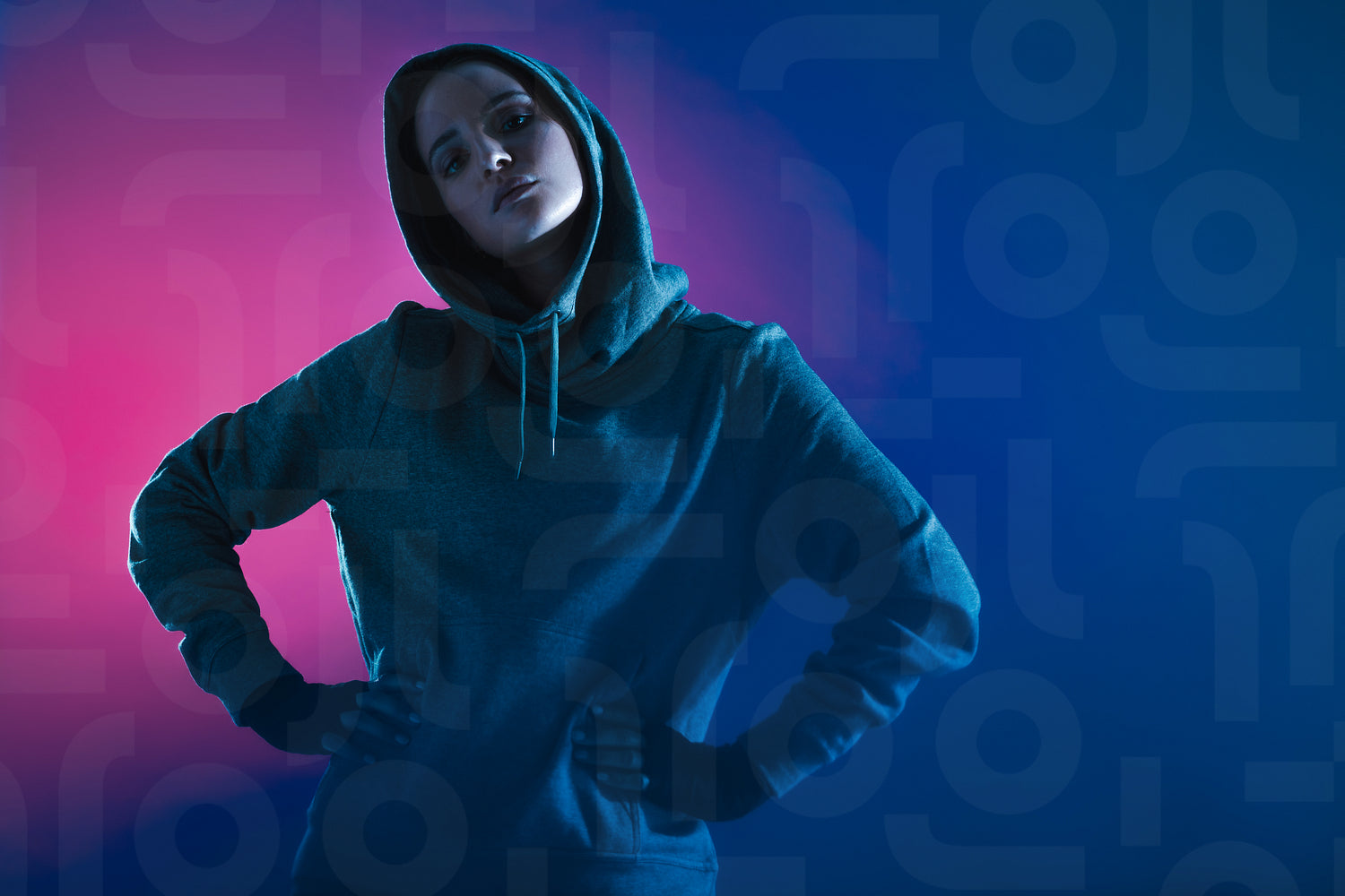 Confident sportswoman wearing a hooded shirt. Fitness female looking at camera with hands on hips against colored background with gel effect.