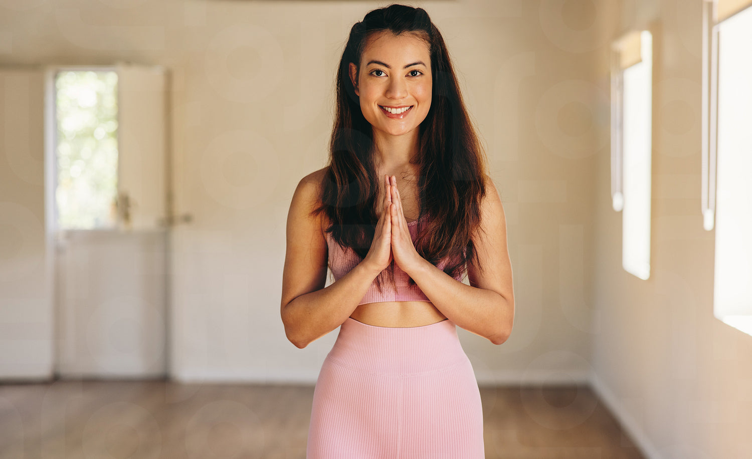 Portrait of a happy young woman smiling at the camera while standing in prayer pose. Cheerful young woman practicing hatha yoga in a yoga studio.