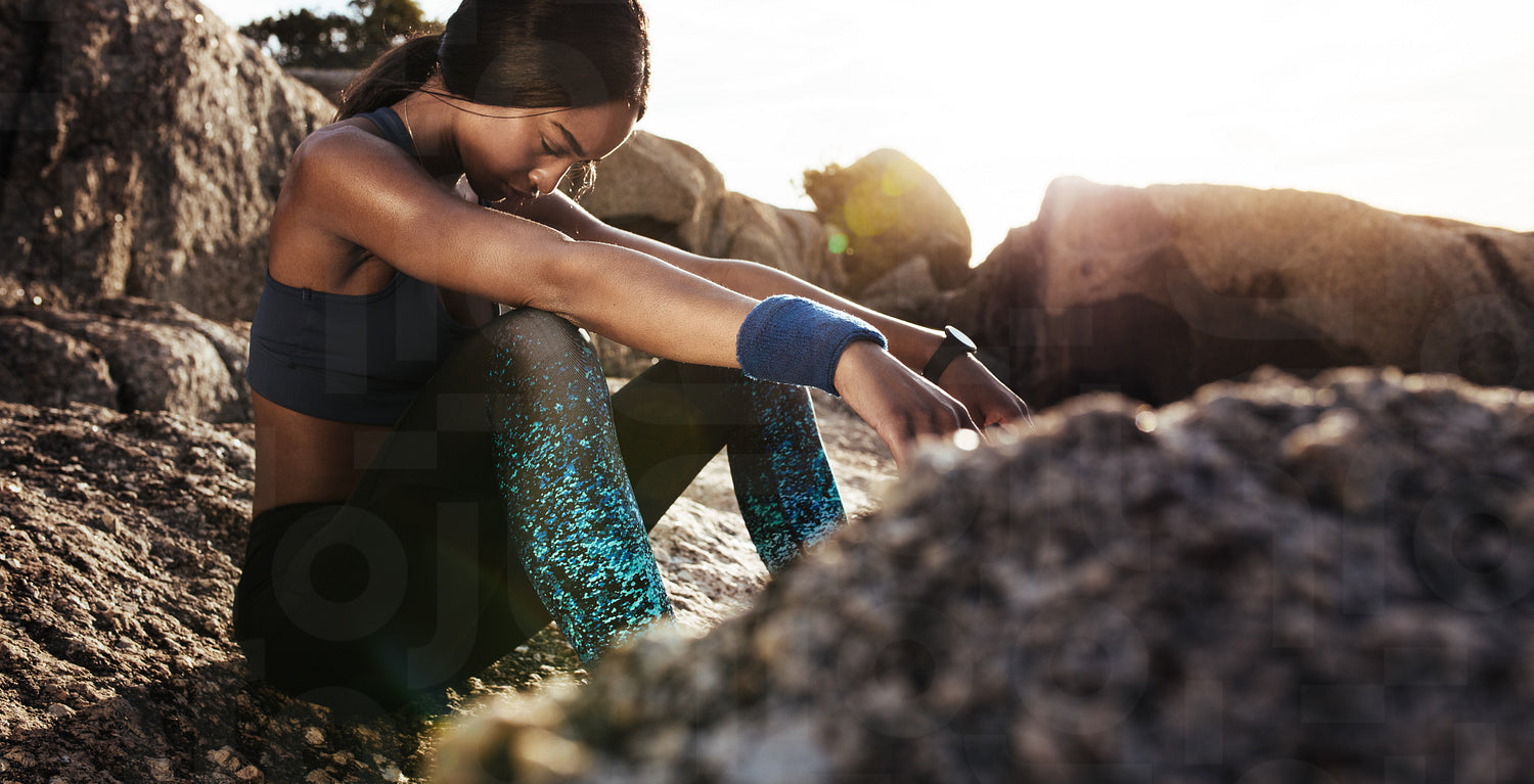 Fitness woman looking tired after intense workout. Sportswoman sitting over rocks at the beach.