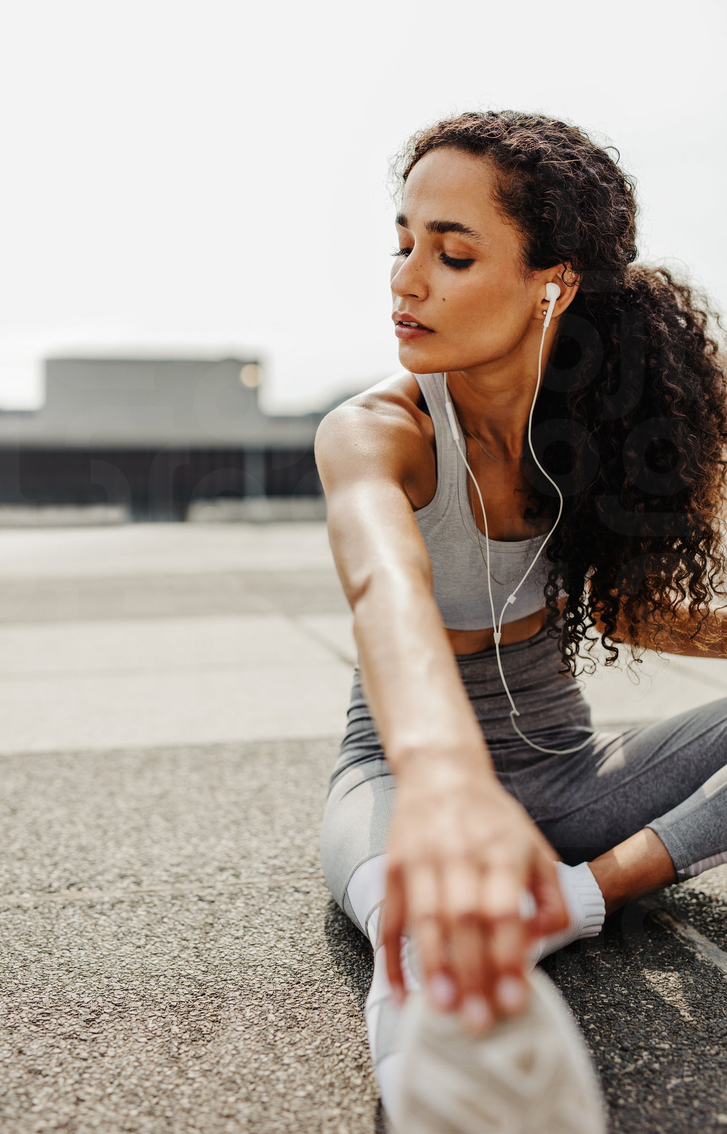 Fitness woman sitting outdoors and stretching. Sporty woman doing some stretching exercises in morning.