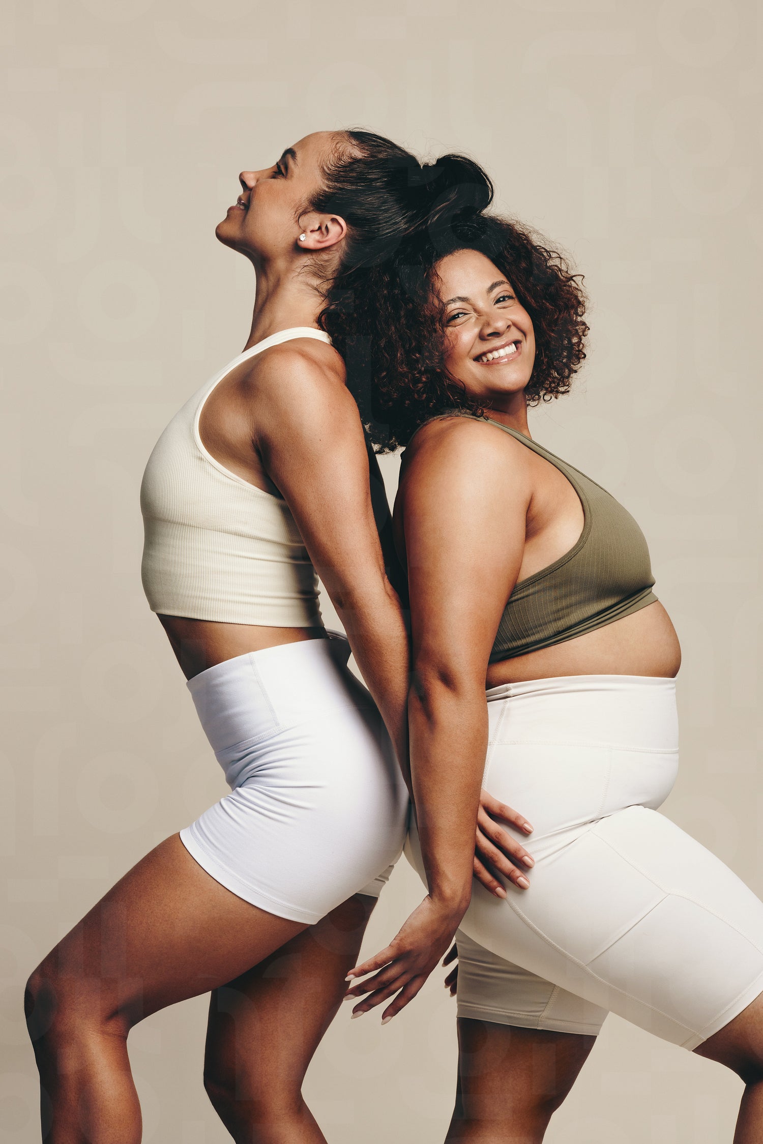 Diverse fitness models pose for the camera in a studio, wearing workout attire. Standing back to back, these two female athletes show their toned bodies, result of their commitment to fitness.