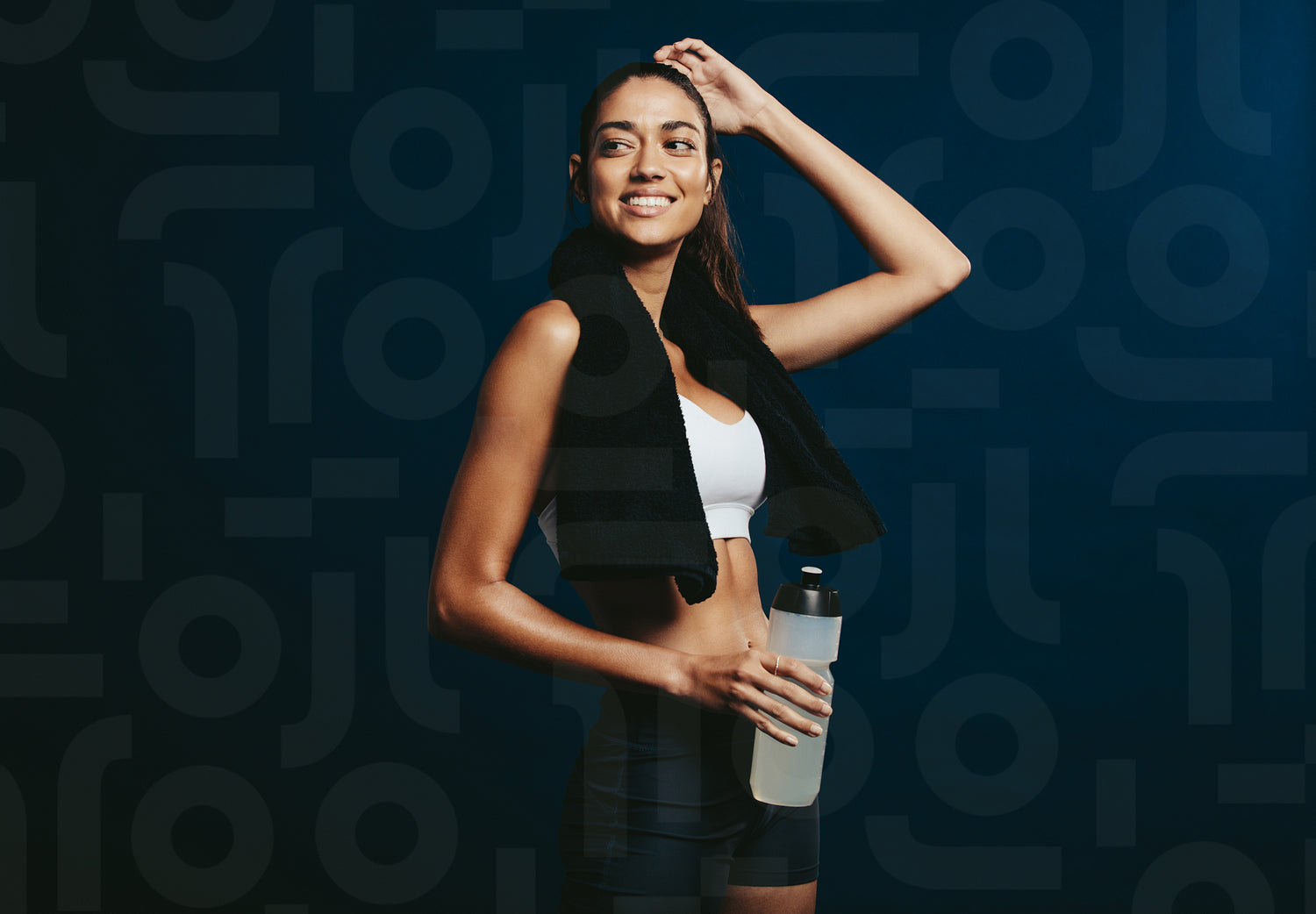 Healthy woman holding a water bottle looking away. Woman in fitness wear looking away and smiling with a towel on her neck.
