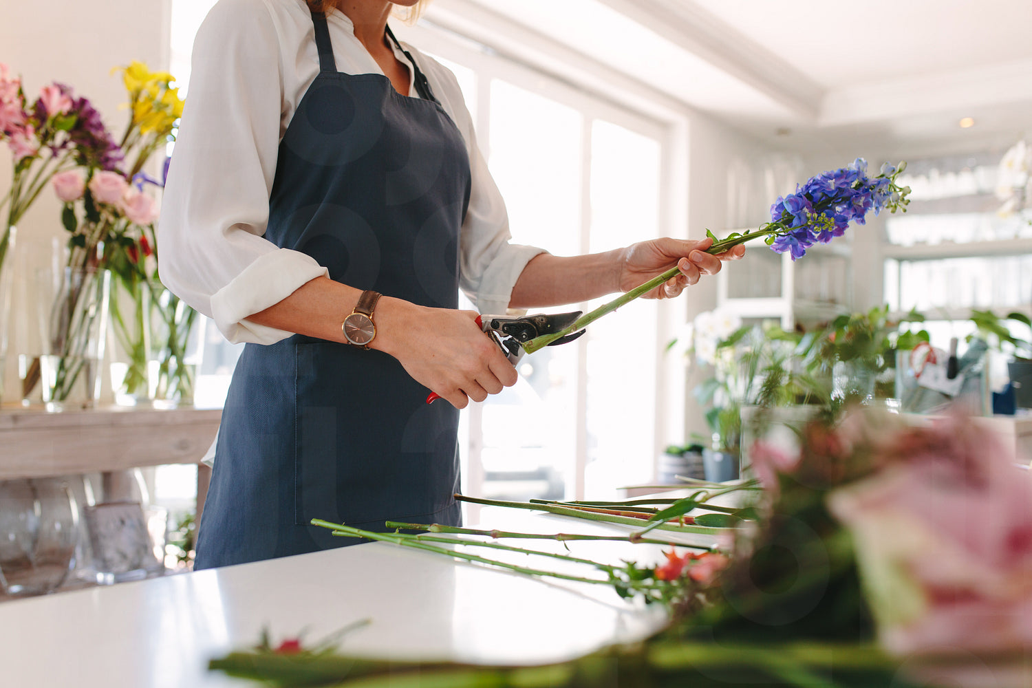 Female florist creating bouquet of flowers at shop. Hands of young woman florist cutting flowers with scissors and designing bouquet on counter.