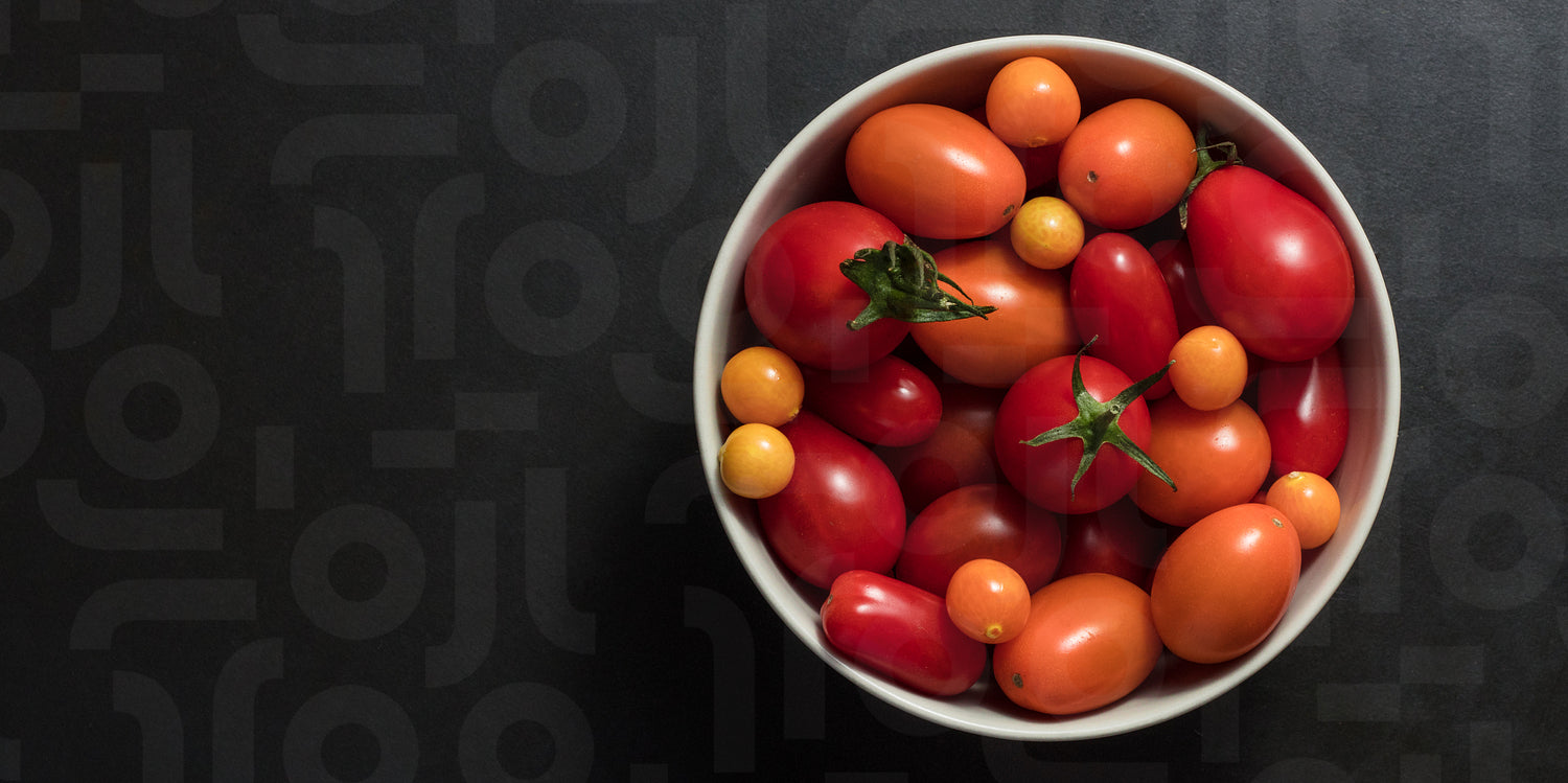 Bowl containing tomatoes placed on a black background. Sea berries along with tomatoes in a bowl.