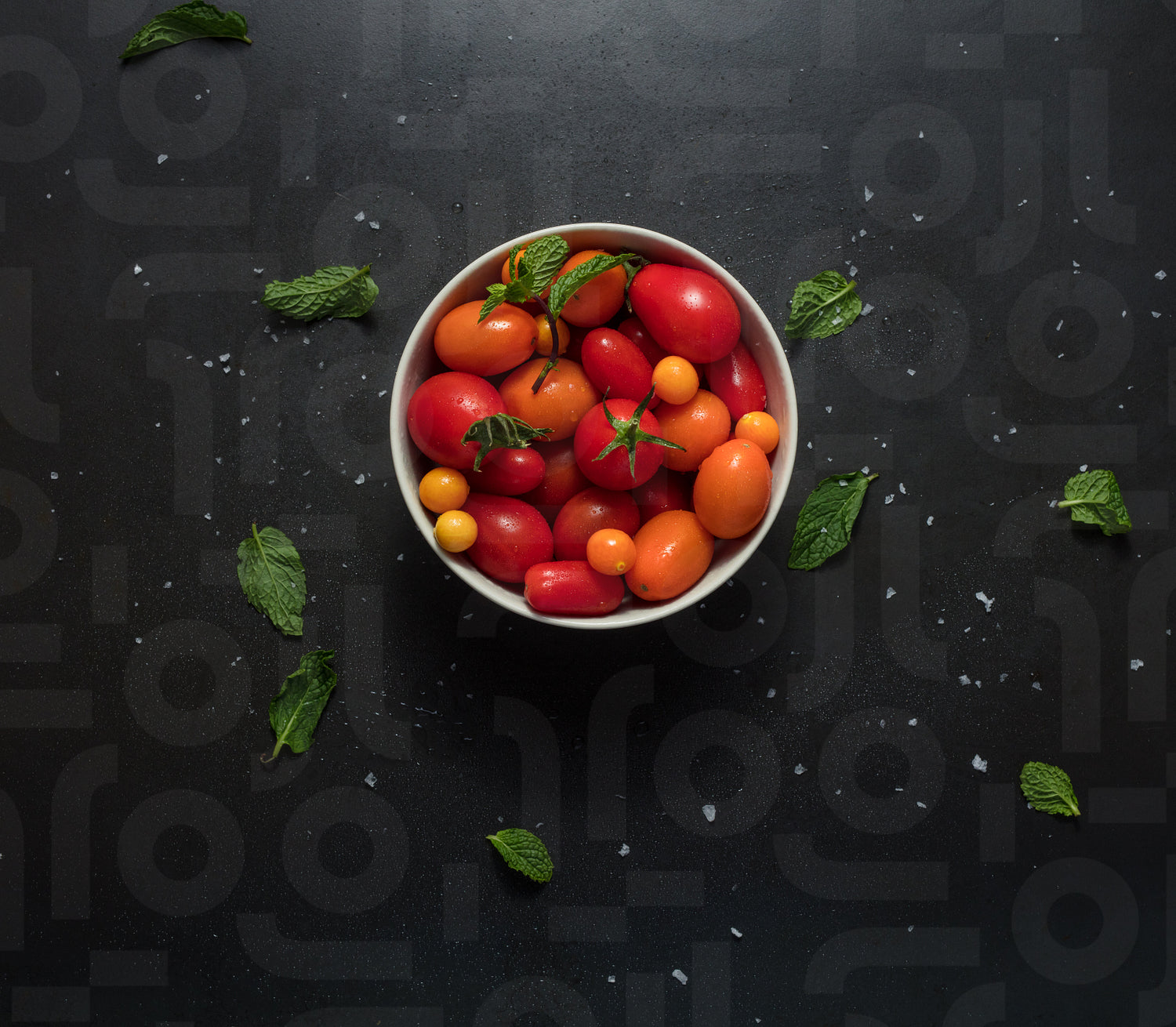 Bowl containing tomatoes placed on a black background with mint scattered around. Sea berries along with tomatoes in a bowl.