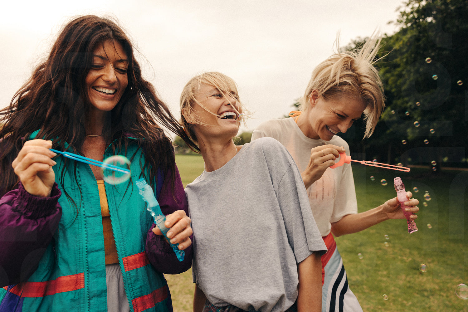 Three women enjoy a day in the park, celebrating friendship by blowing bubbles and playing games. Genuine laughter and smiles fill the air as they socialize and have fun together. This photo has intentional use of 35mm film grain.