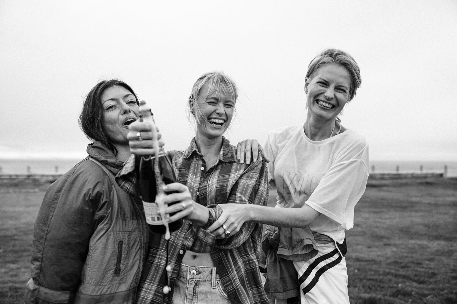 Happy friends pop a champagne bottle outdoors, celebrating and having fun together. Group of women laughing with joy in an authentic moment of friendship. This photo has intentional use of 35mm film grain.