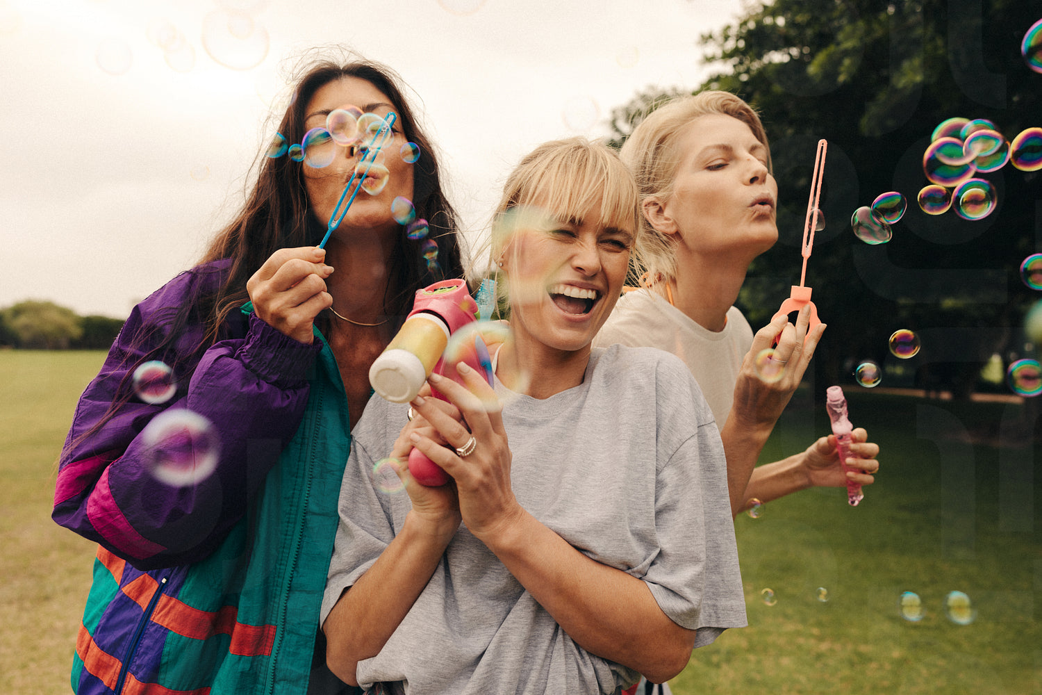 Friends hanging out together in a park, celebrating life and having fun. They are blowing bubbles, laughing, and socializing, all while wearing casual clothing and authentic smiles. This photo has intentional use of 35mm film grain.