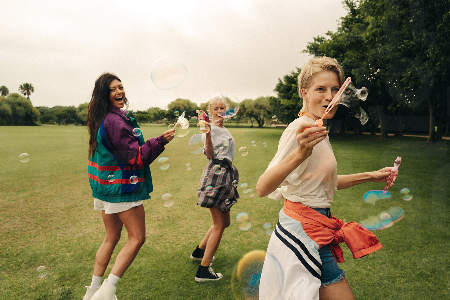 Three cheerful women having a blast outdoors, celebrating friendship and life. Group of friends blowing bubbles and laughing, enjoying a carefree summer day in the park. This photo has intentional use of 35mm film grain.