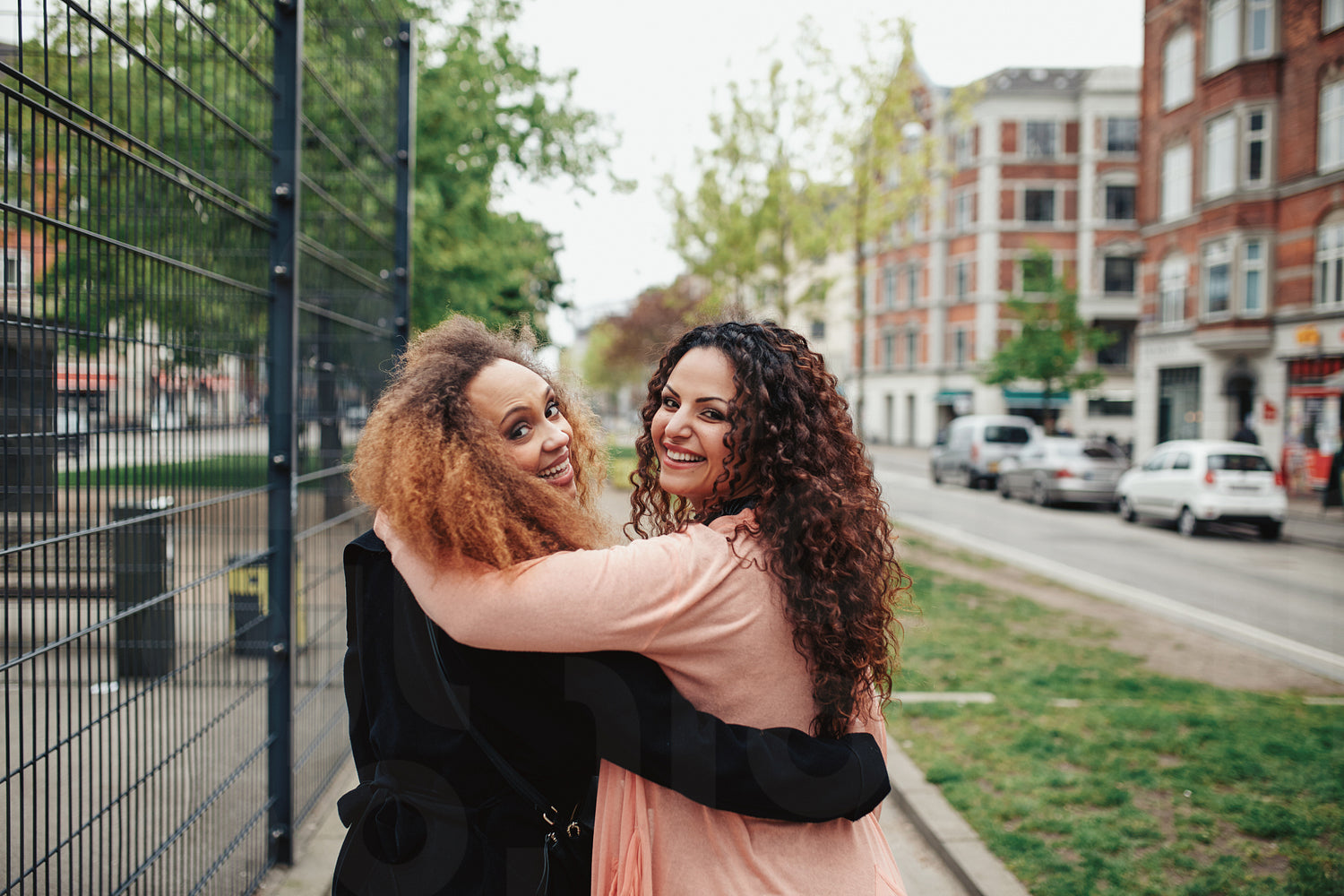 Outdoor shot of two girlfriends walking through town looking over shoulder smiling. Happy young women walking together along a city street.