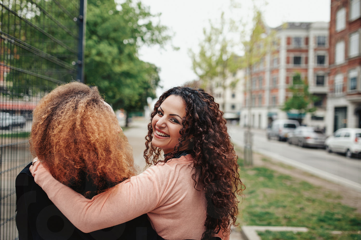 Rear view shot of young woman walking with her friend looking back over her shoulder. Two women walking along city street.