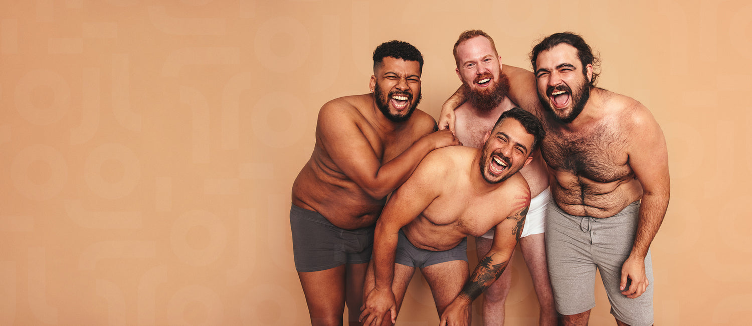 Best friends laughing together with their shirts off. Four body positive men having fun while standing together in a studio. Group of self-confident young men feeling comfortable in their natural bodies.