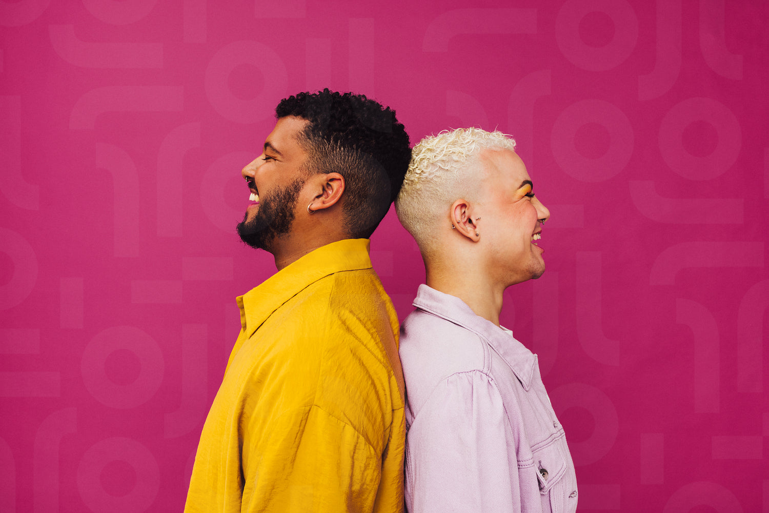 Cheerful gay couple standing together in a studio. Sideview of a beautiful gay couple with piercings standing back to back against a purple background. Young LGBTQ+ couple smiling happily.