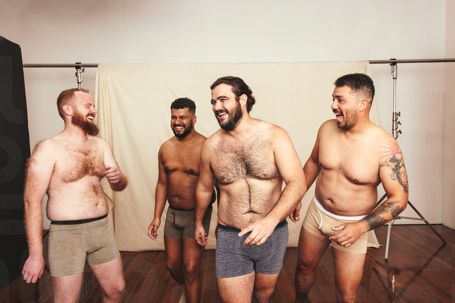 Cheerful men laughing together while standing in a modern studio. Group of self-confident young men wearing underwear. Four shirtless young men embracing their natural bodies.