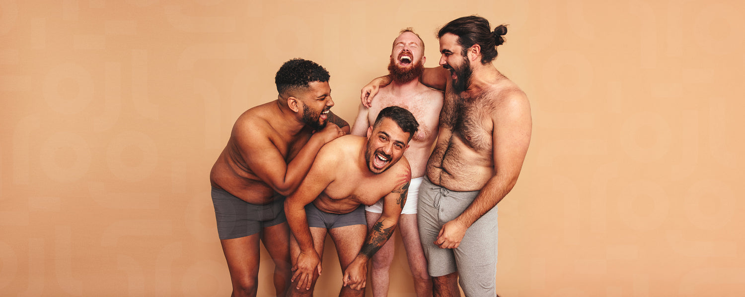 Fun time in the studio. Four body positive men laughing cheerfully while standing together in a studio. Group of self-confident young men feeling comfortable in their natural bodies.