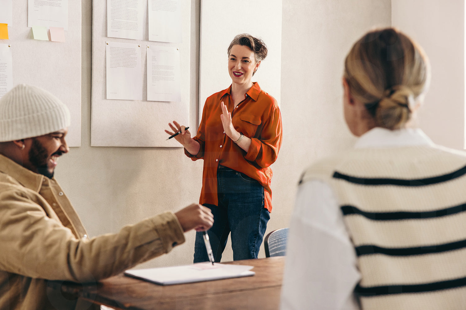 Happy businesswoman giving a presentation to her team during a meeting. Female team leader having a discussion with her colleagues. Group of creative businesspeople working together in an office.