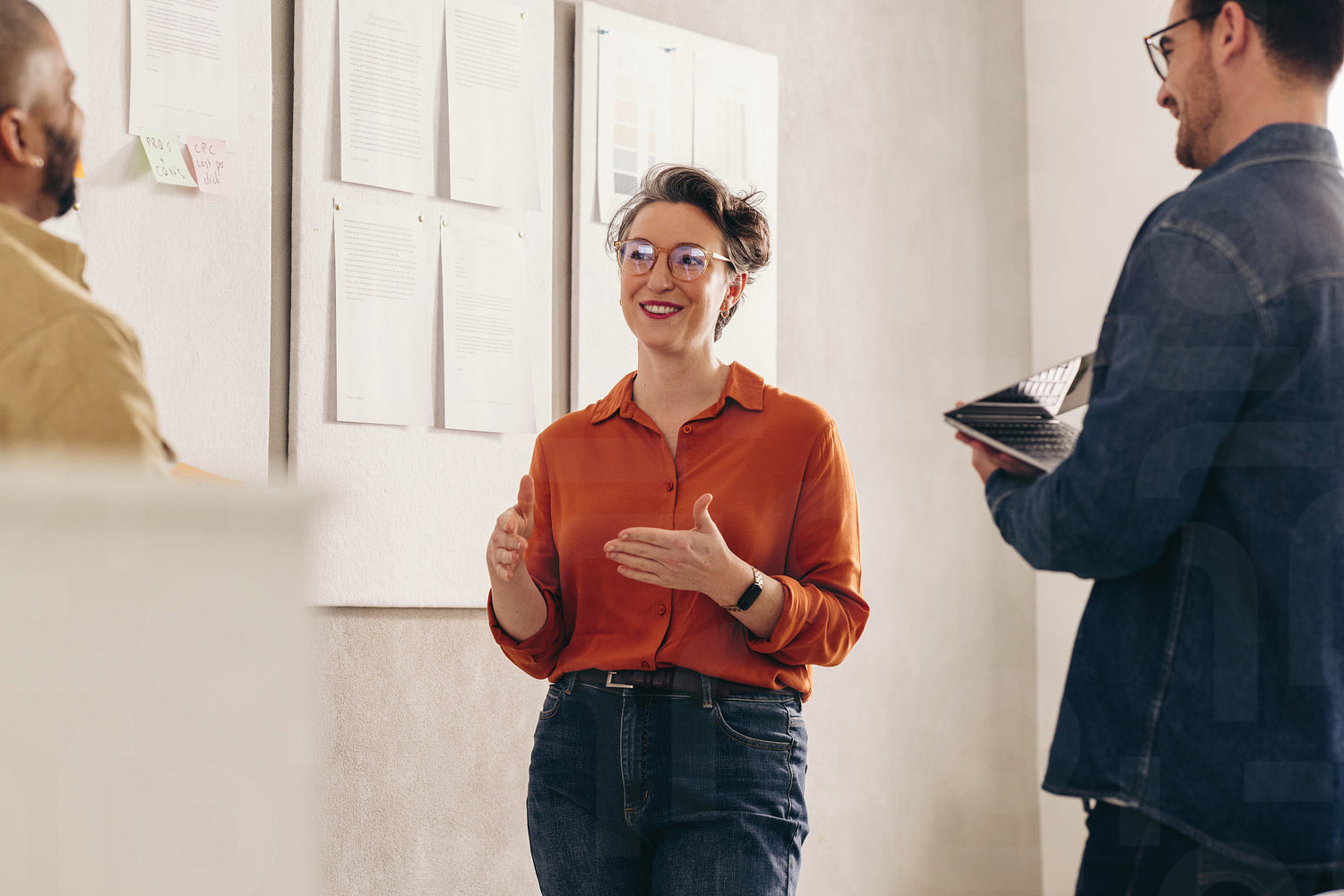 Happy businesswoman having a discussion with her team next to some notice boards. Group of cheerful business colleagues sharing ideas during a meeting in a creative office.