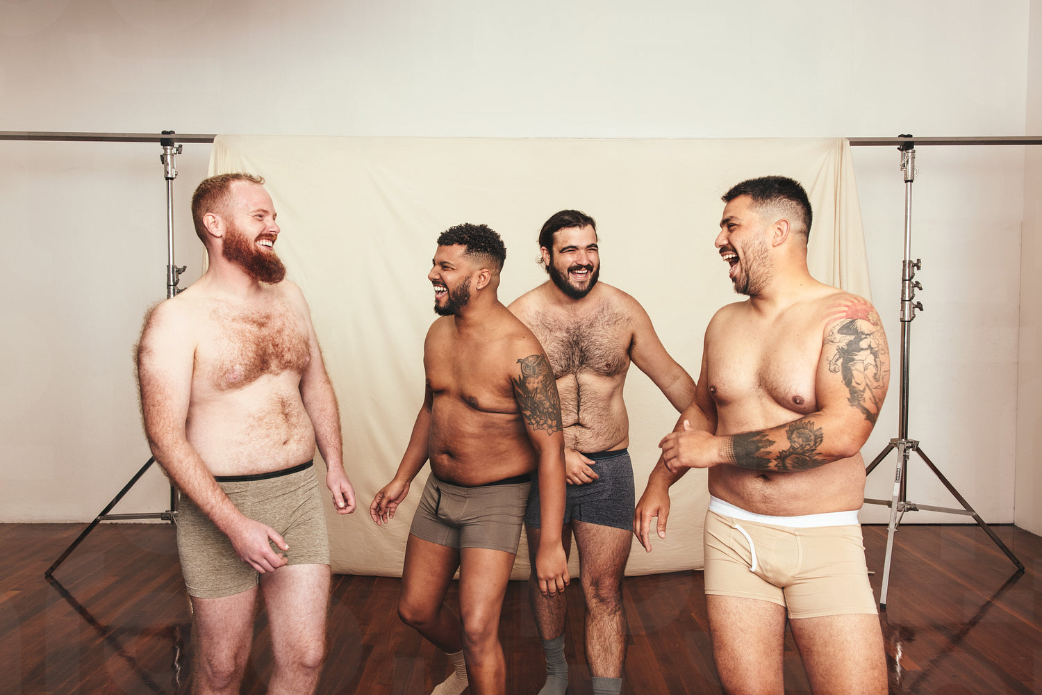 Laughter in the studio. Group of self-confident young men laughing cheerfully while wearing underwear in a modern studio. Four shirtless young men embracing their natural bodies.