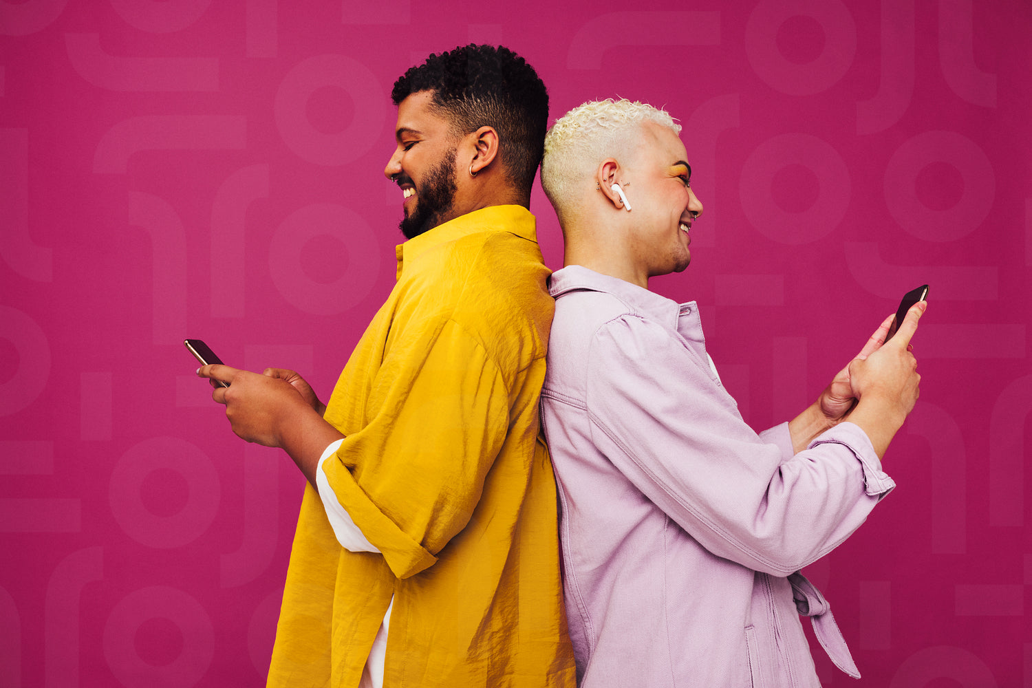Smiling gay couple using mobile phones in a studio. Happy young couple texting while standing back to back against a purple background. Cute gay couple enjoying being online.