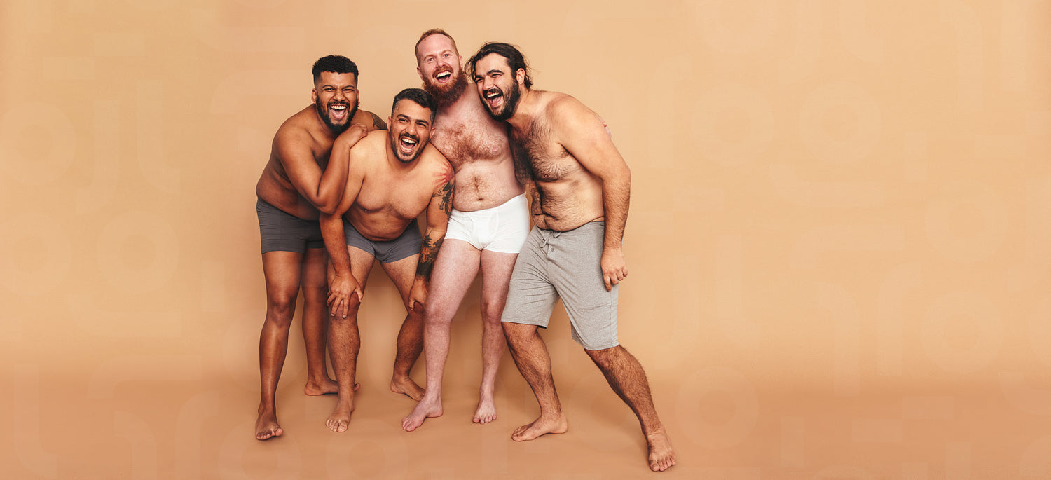 Studio fun. Four body positive men laughing cheerfully while standing together with their shirts off. Group of self-confident young men feeling comfortable in their natural bodies.