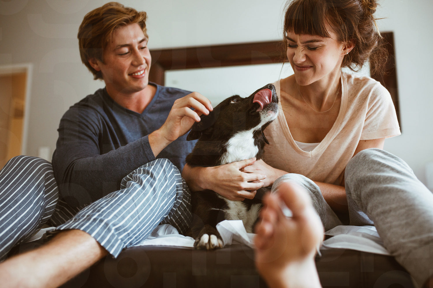 Couple pampering a dog sitting on bed at home. Man and woman sitting with their pet dog on bed and playing with it.