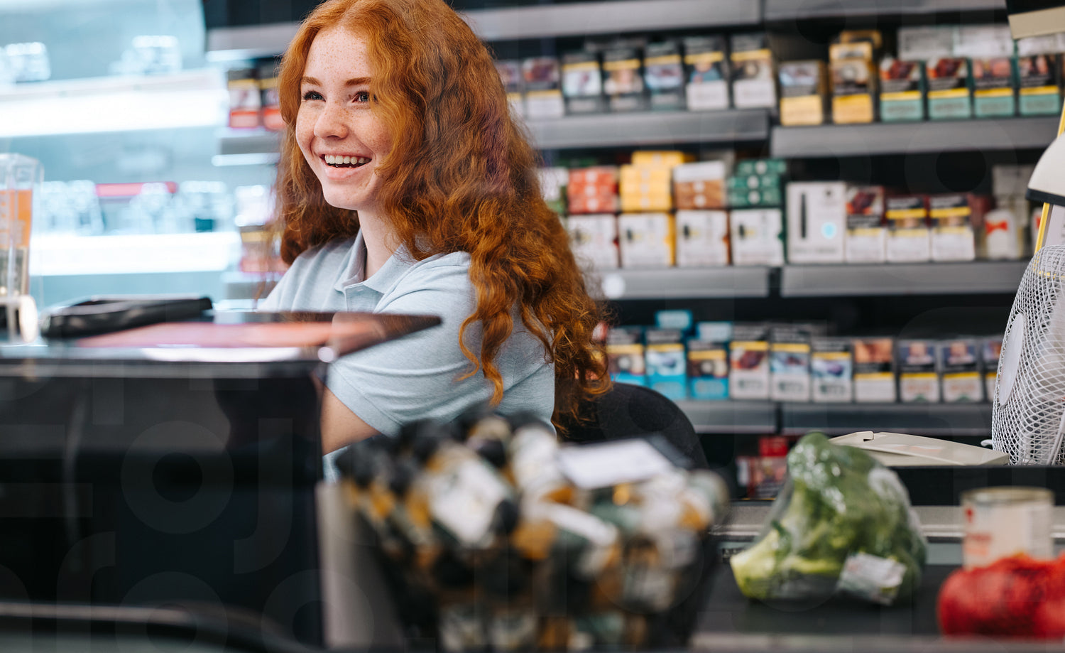Happy female cashier attending customer at the supermarket. Woman working at grocery store checkout.