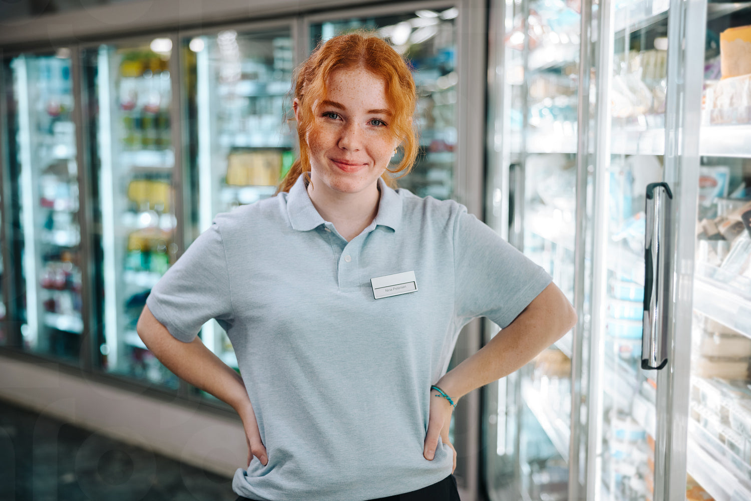 Portrait of a female student working in grocery store. Woman on holiday job at modern supermarket.