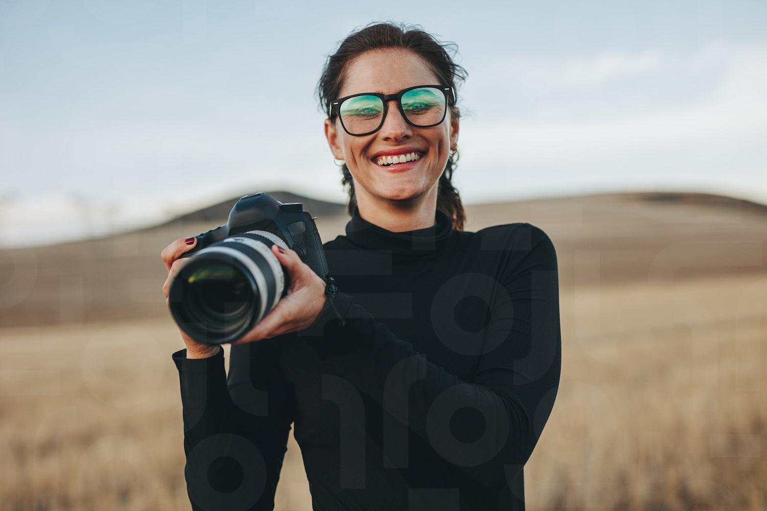 Positive photographer enjoying photo shooting outdoors. Young woman in casual holding a dslr camera and smiling.