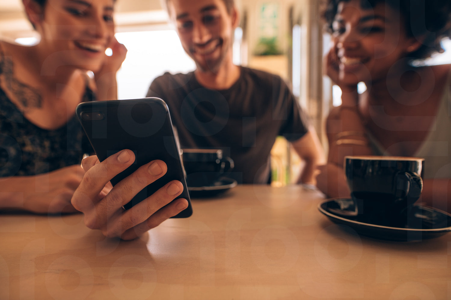 Three young people looking at mobile phone and smiling while sitting at restaurant table. Man showing something interesting to female friends during meeting at coffee shop.