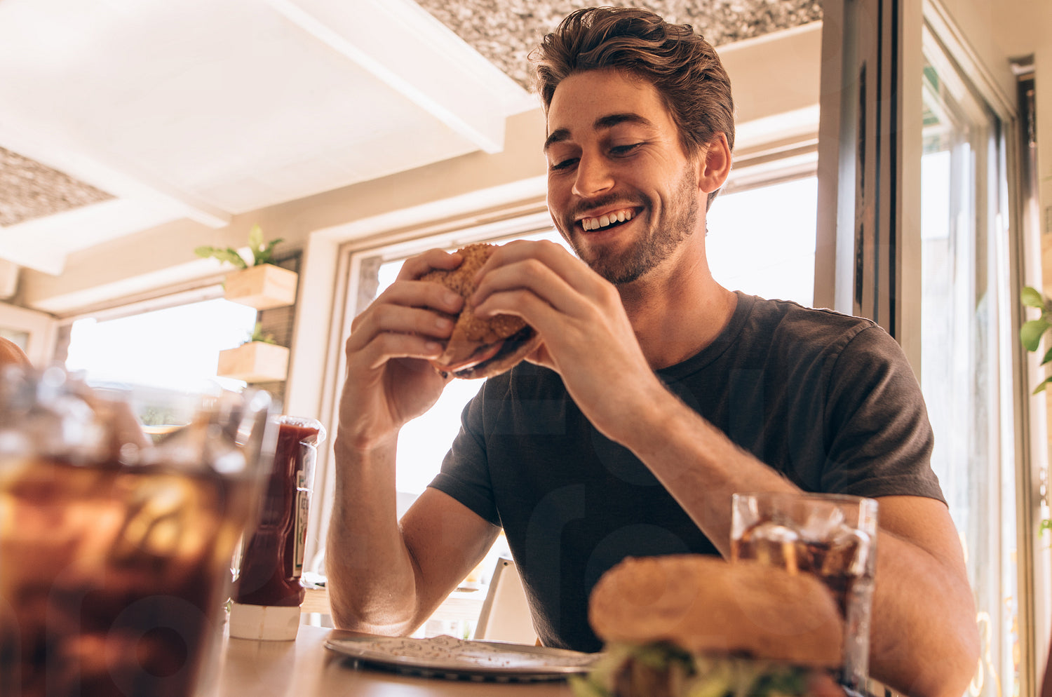 Happy young man eating a delicious burger at restaurant. Hungry young guy having stacked burger at fast food cafe.