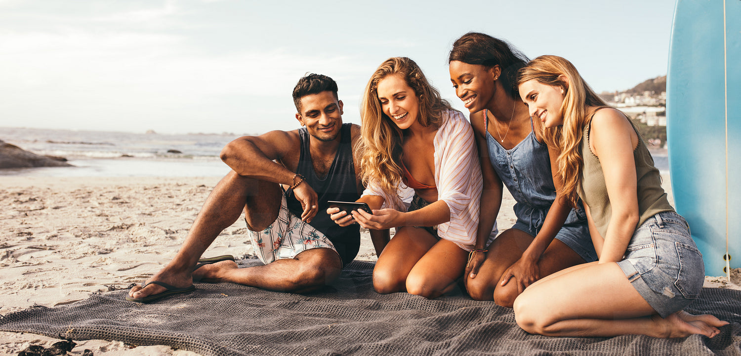 Smiling woman taking selfie with her friends sitting on a beach with a surfboard in the background. Man and women on a vacation sitting together on a beach looking at a mobile phone.