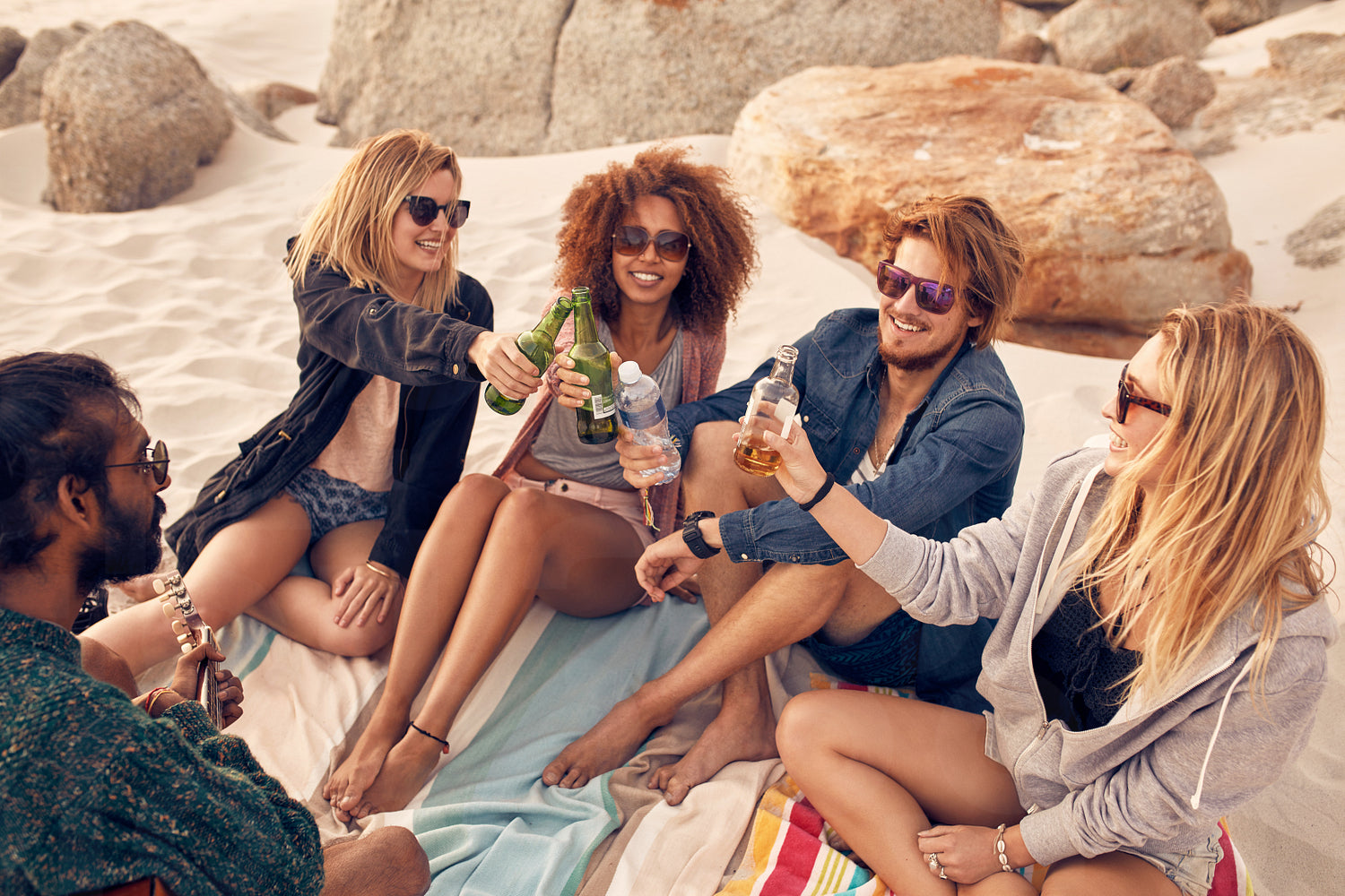 Group of young people toasting beers while sitting at the beach. Mixed race friends celebrating with drinks at beach party.