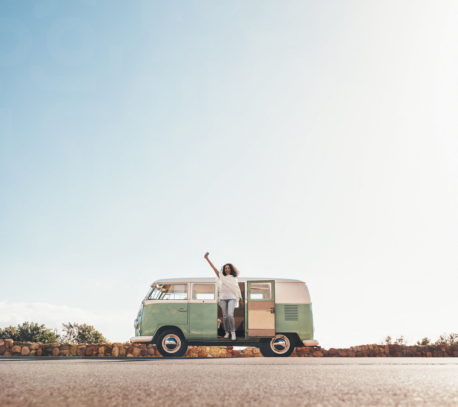Woman on road trip travelling in a van. Young african female jumping out of a old minivan on highway. Square shot with lots of copy space.