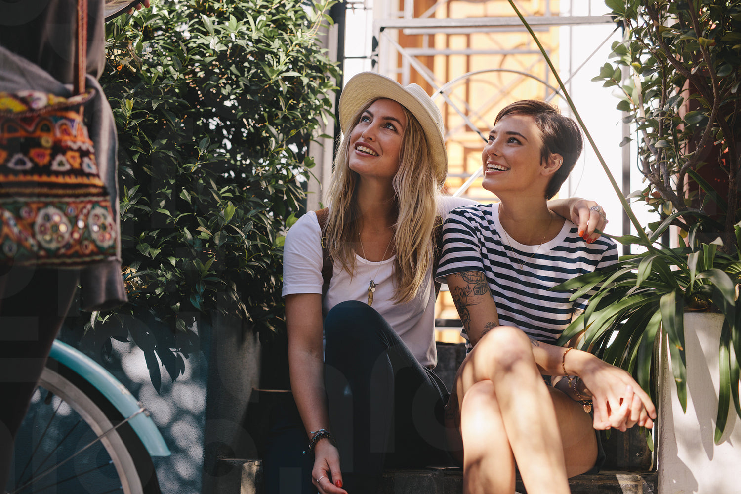 Two young woman sitting outdoors and looking away. Female friends relaxing by the street.