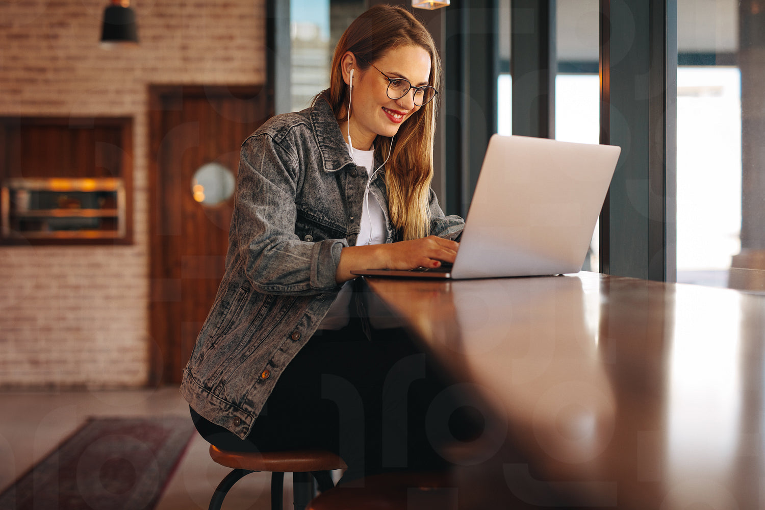 Woman sitting at cafe and working on her laptop computer. Smiling young female working from a cafe.