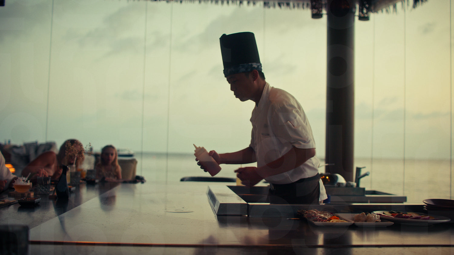 Guests are delighted by a skilled teppanyaki chef creating a spectacular fire display during a unique fine dining experience. The luxury resort setting offers stunning ocean views at sunset.