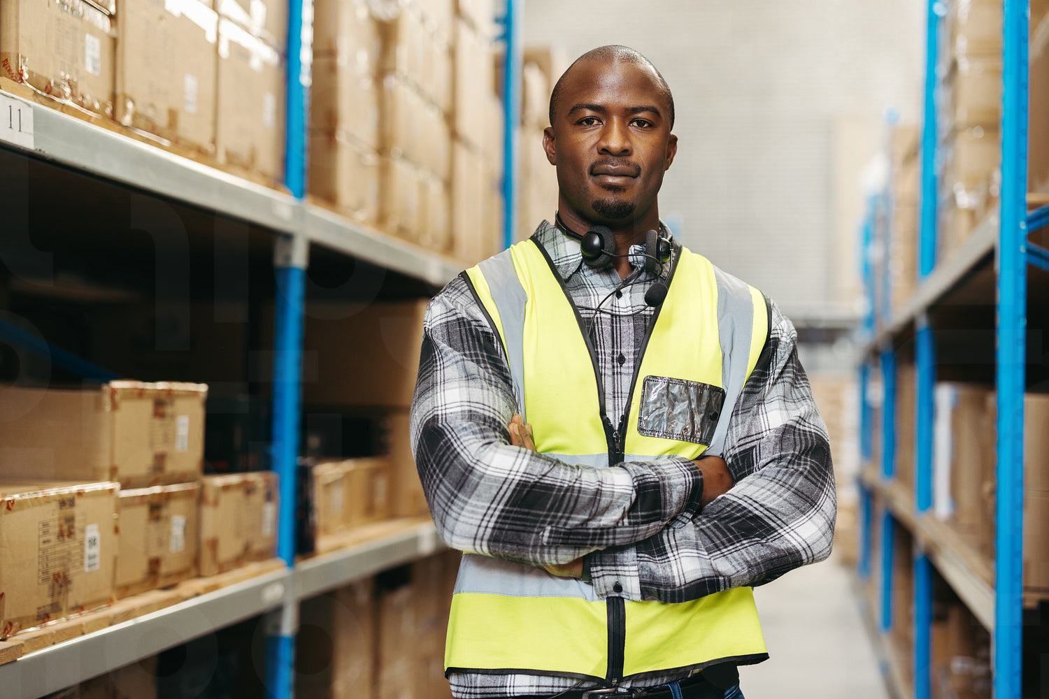 Male warehouse picker looking at the camera with a headset around his neck. Young warehouse employee working with voice-picking technology in a modern distribution centre.