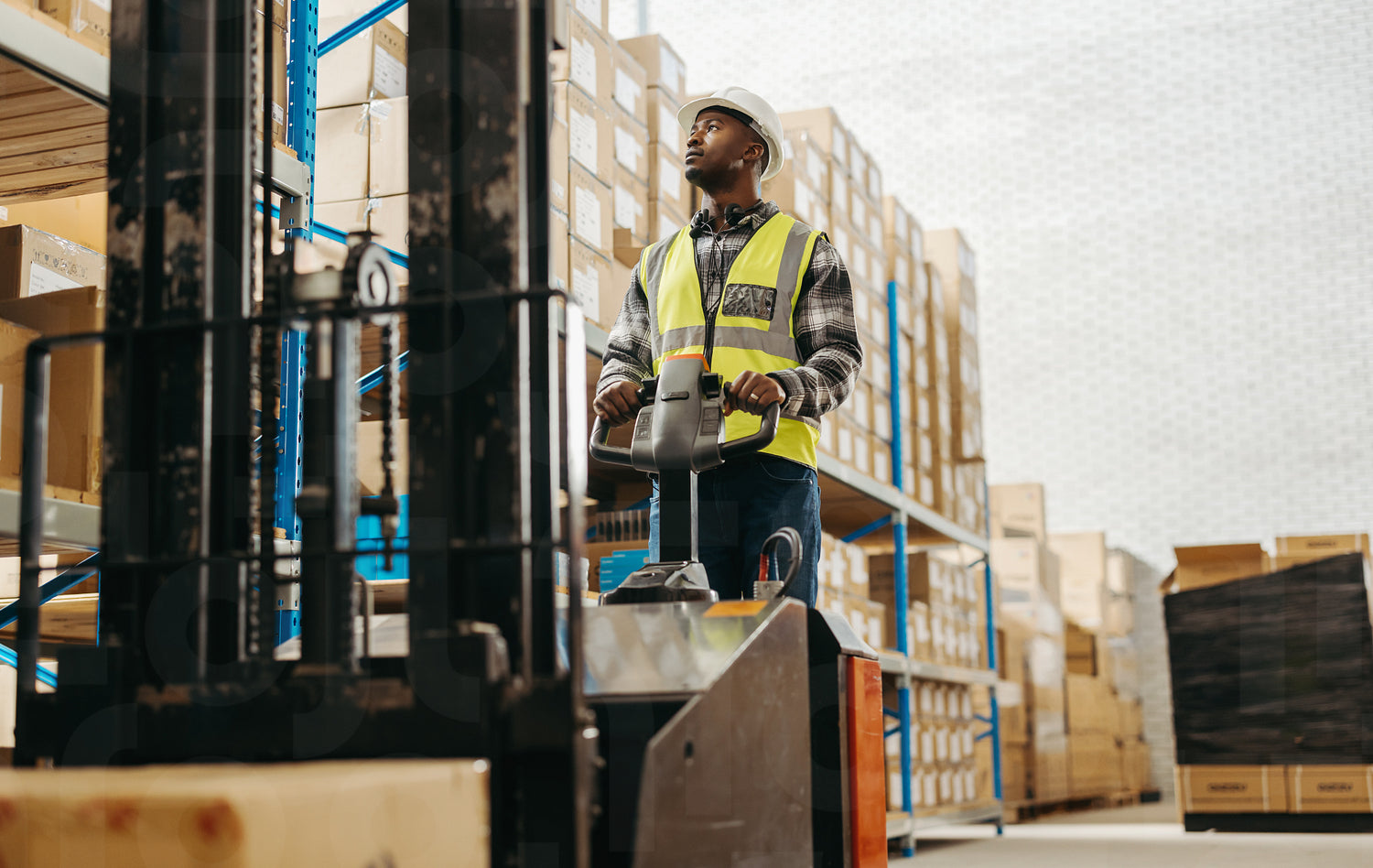 Young man in a reflective jacket driving a forklift in a large distribution warehouse. Male logistics employee moving goods around within a modern fulfillment centre.