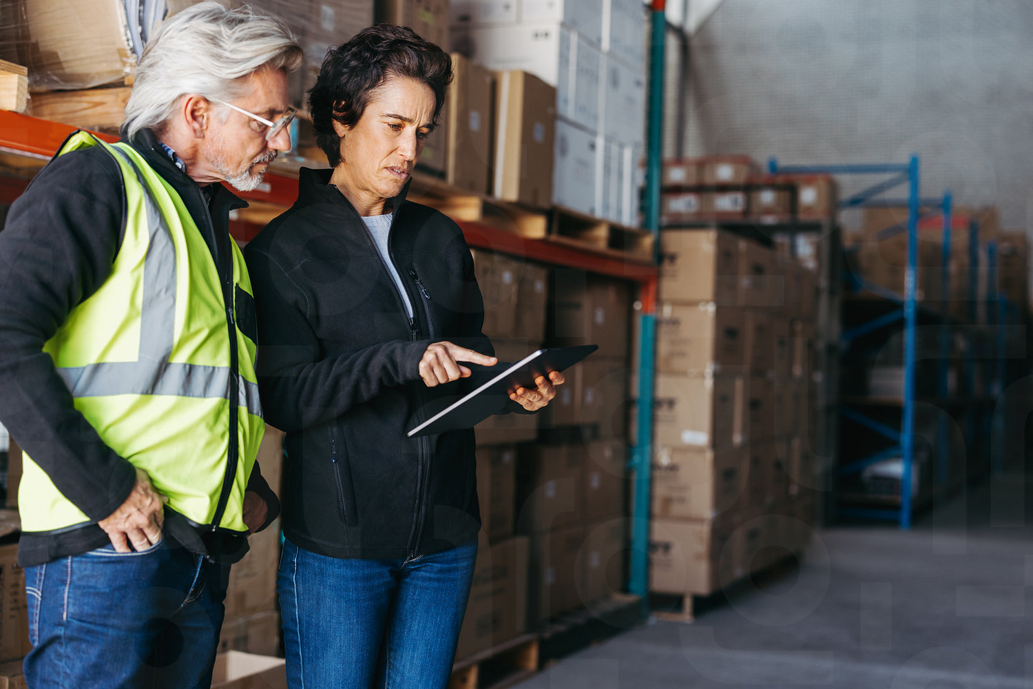 Two mature warehouse managers having a discussion while using a digital tablet. Senior logistics workers working with warehouse management software in a distribution centre.