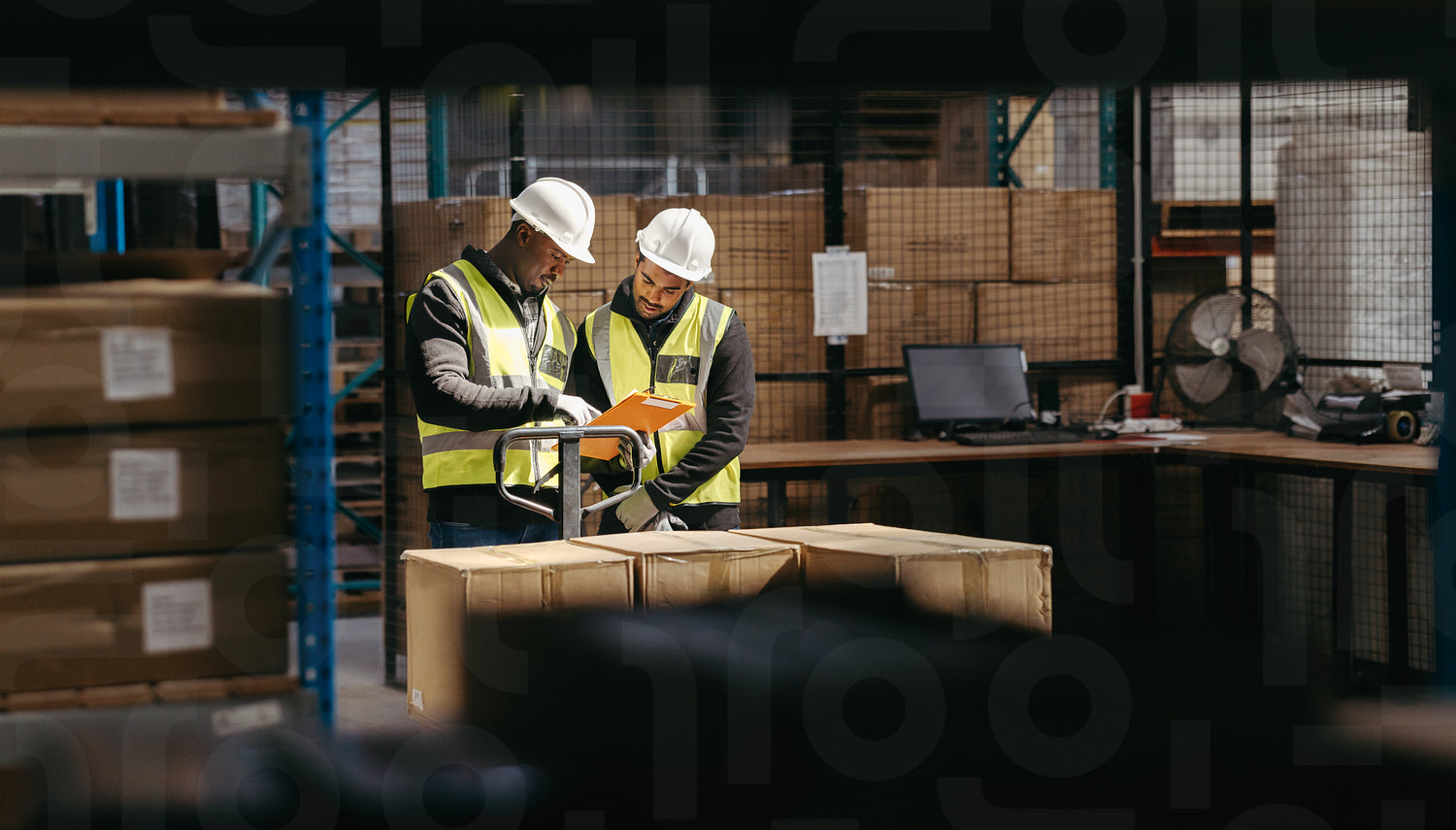 Warehouse employees reading a clipboard while standing with a packed pallet truck in a logistics centre. Two young men taking packages for shipment in a large distribution centre.